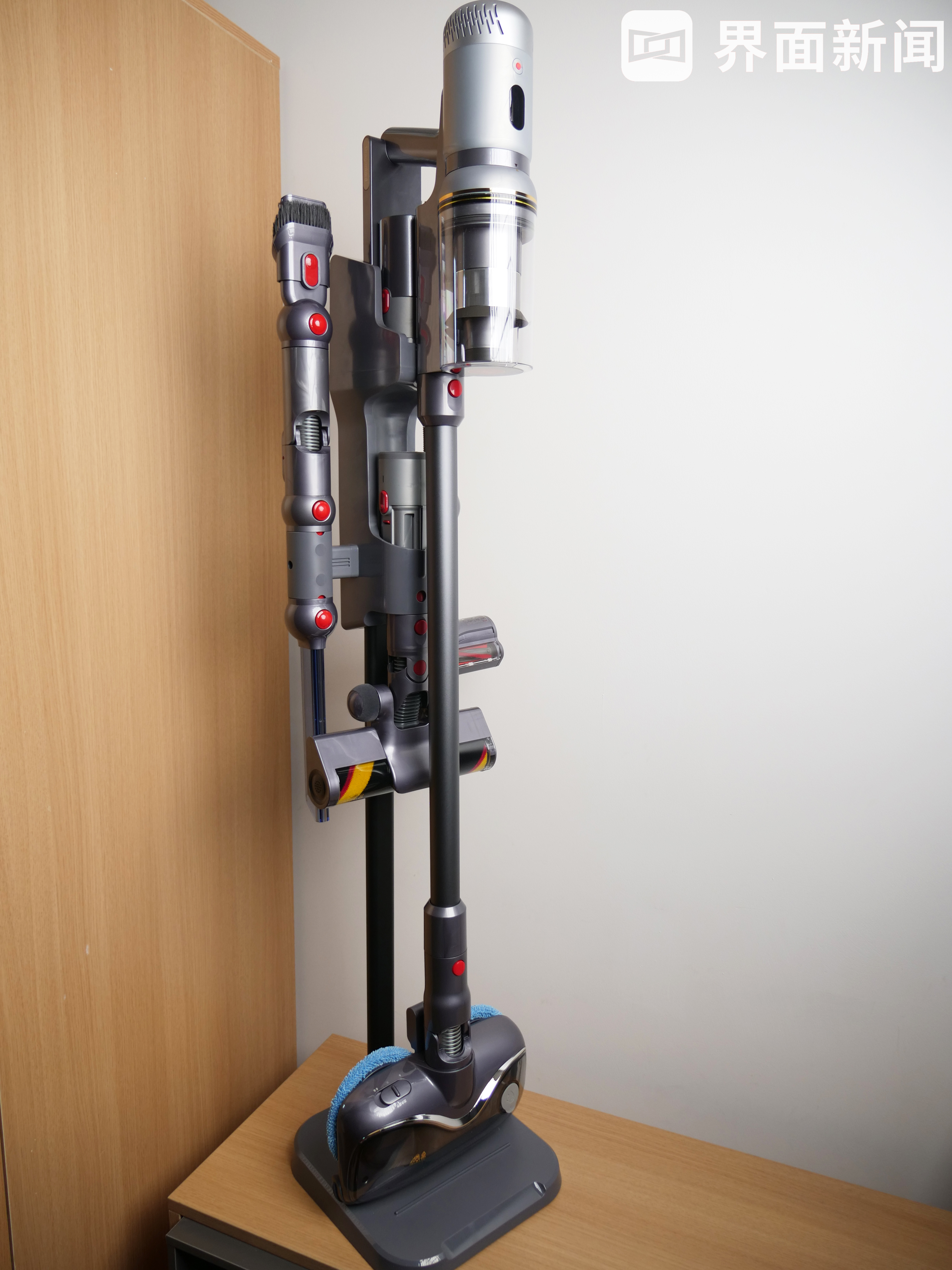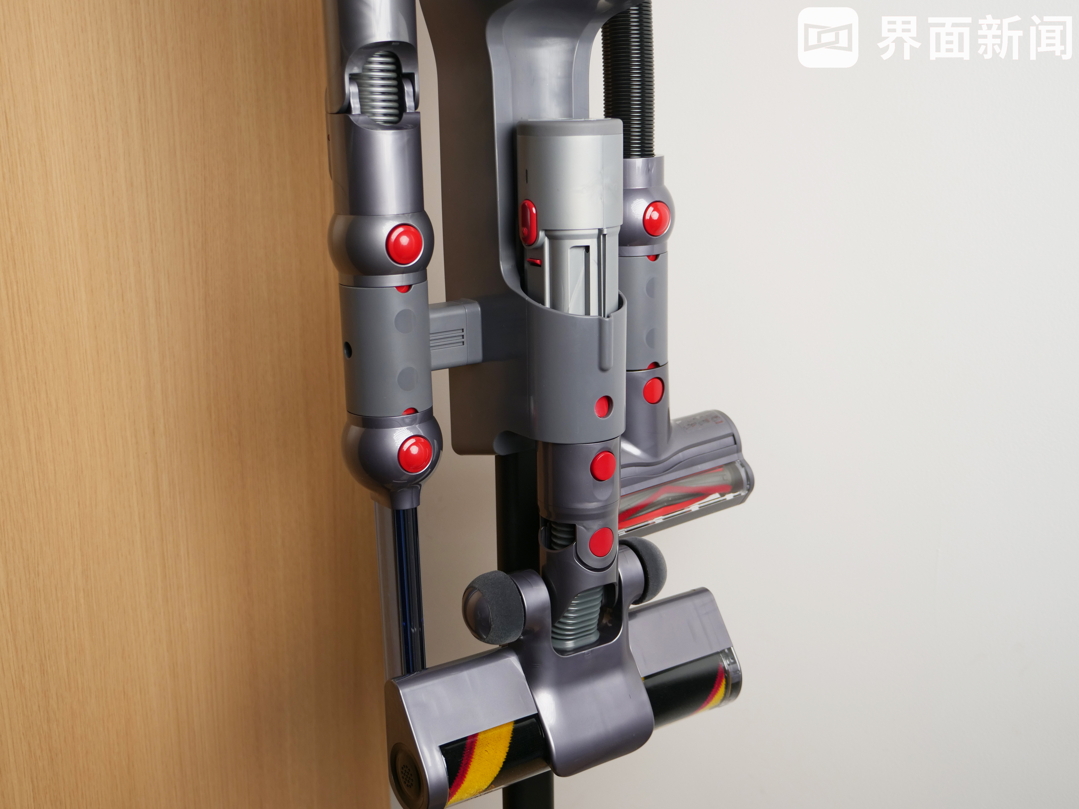 具体来看,吸尘器可竖直挂在收纳支架上,并且此时会开启充电,而支架左右两边及下方共有五个卡口,进行组合后,可将包含伸缩软管等在内的所有配件以及刷头,全部纵向进行收纳,有效节省了吸尘器的收纳空间。