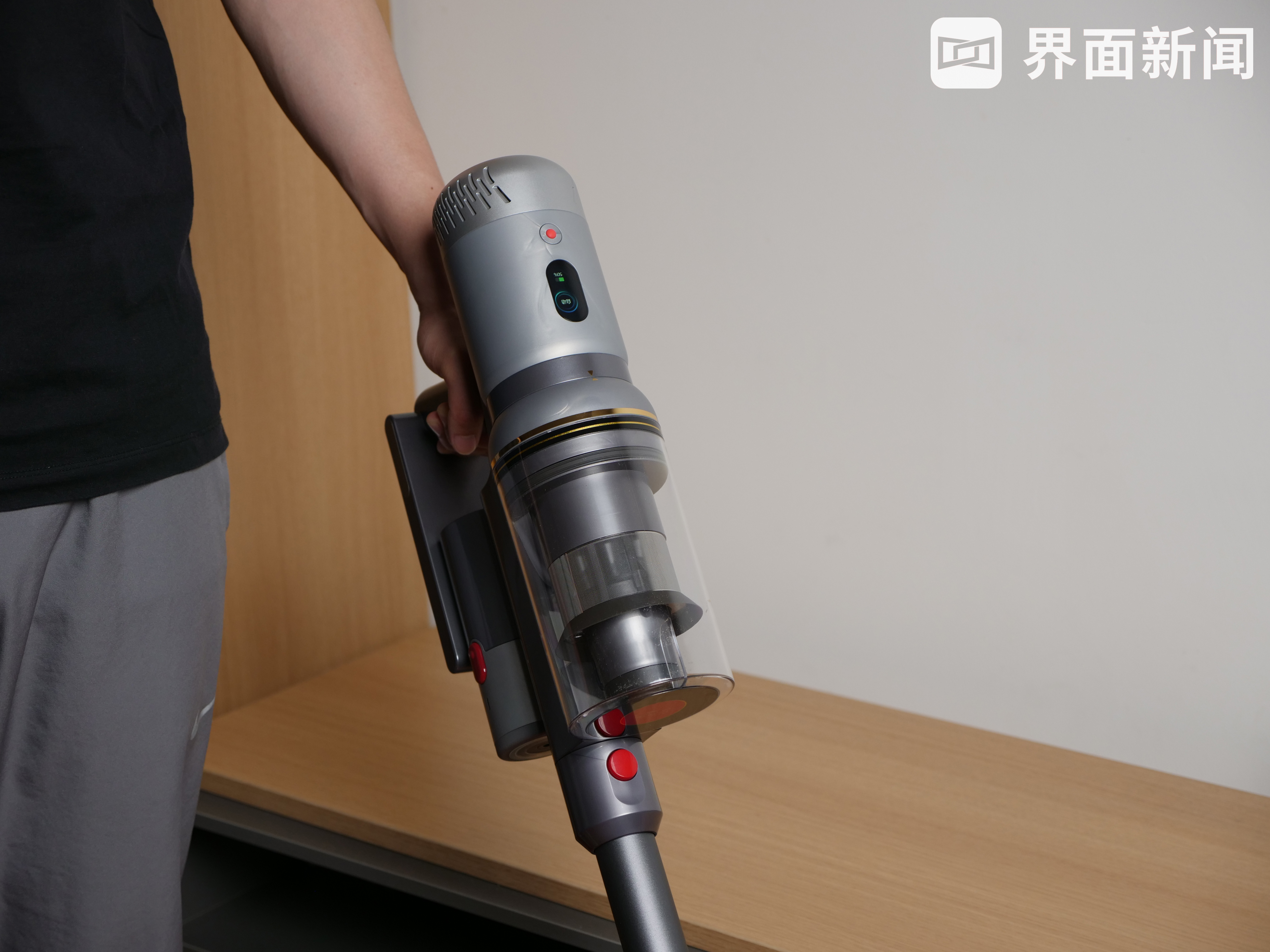 因此,T21 Plus Rinse在吸尘器里算是比较轻便的“选手”,即使是高举与地面清洁切换、实际打扫约90平的面积后,我也没有感到很强的累手感。除了重量控制,轻便也得益于T21 Plus Rinse的无线造型,重心会集中在机身后侧的把手处,降低了握持时的负担。