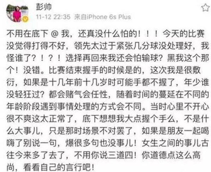 彭帅发微博怒斥网友 东京赛“中国德比”争议不休