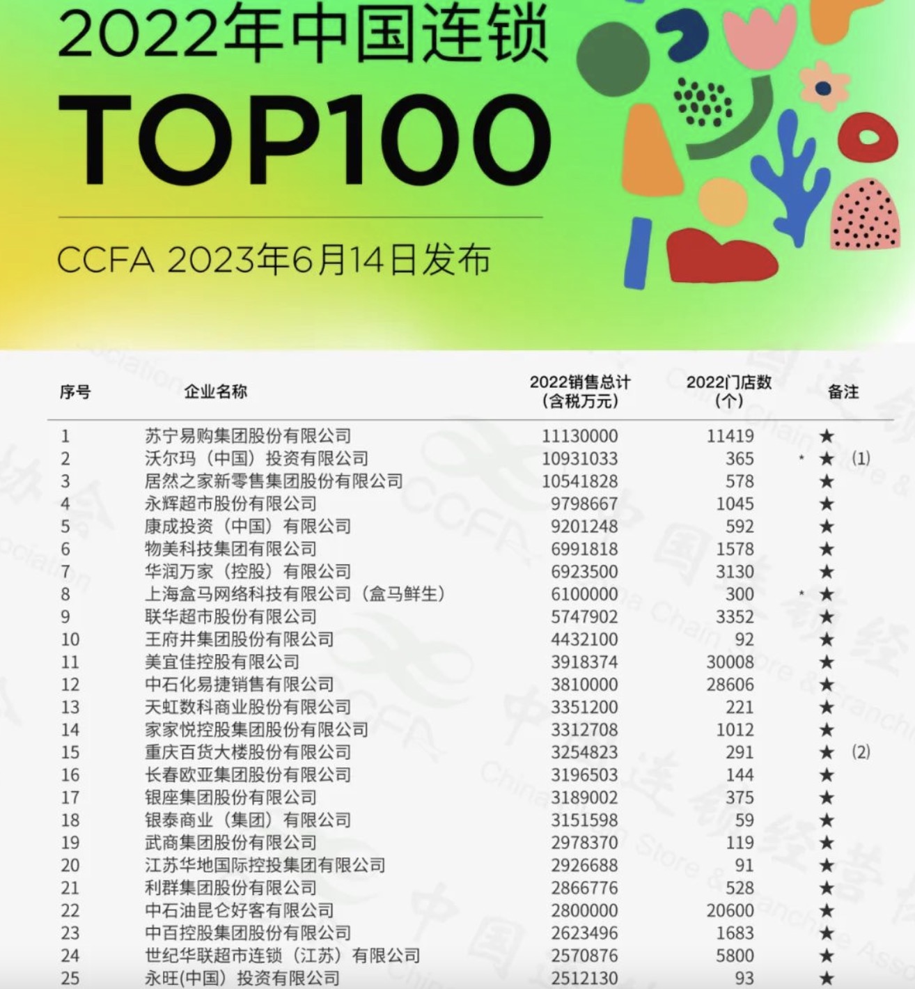 6月14日晚间,中国连锁经营协会发布《2022中国连锁TOP100》榜单,苏宁易购、沃尔玛、居然之家新零售集团位列前三位,2022年销售额分别为1113亿元、1093亿元和1054亿元,其中,排在第八位的盒马鲜生2022年销售额为610亿元,门店数为300个,以此计算,单店平均销售额超过2亿元。