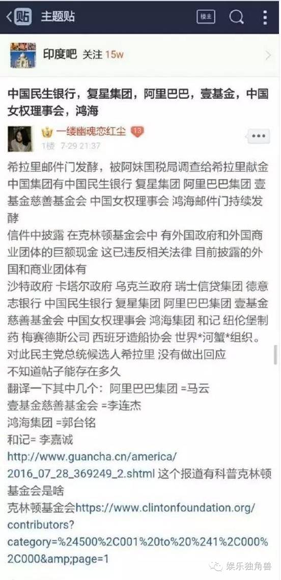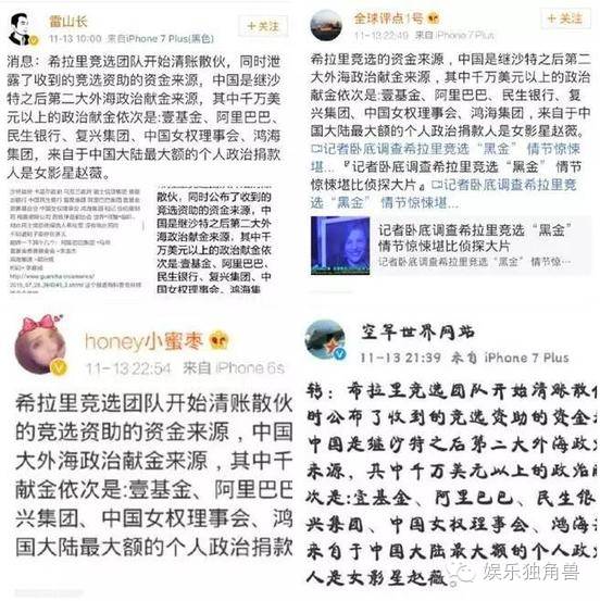 11月13日深夜,微博“宁静致远-公平正义”称:“瞧瞧:希拉里竞选团队开始清账散伙,同时公布了收到的竞选资助的资金来源,中国是继沙特之后第二大外海政治献金来源,其中千万美元以上的政治献金依次是:壹基金、阿里巴巴、民生银行、复兴集团、中国女权理事会、鸿海集团,来自于中国大陆最大额的个人政治捐款人是女影星赵薇。”