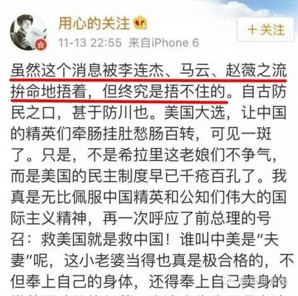 随后“赵薇资助希拉里竞选”的传闻迅速席卷网络,网络舆论发酵下,甚至出现了“赵薇变成一个野心家:控制世界第一大国变成赵薇的终极目标”这样的言论。