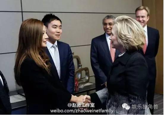而将这俩人牵扯在一起的,是一组赵薇与希拉里握手的合影。