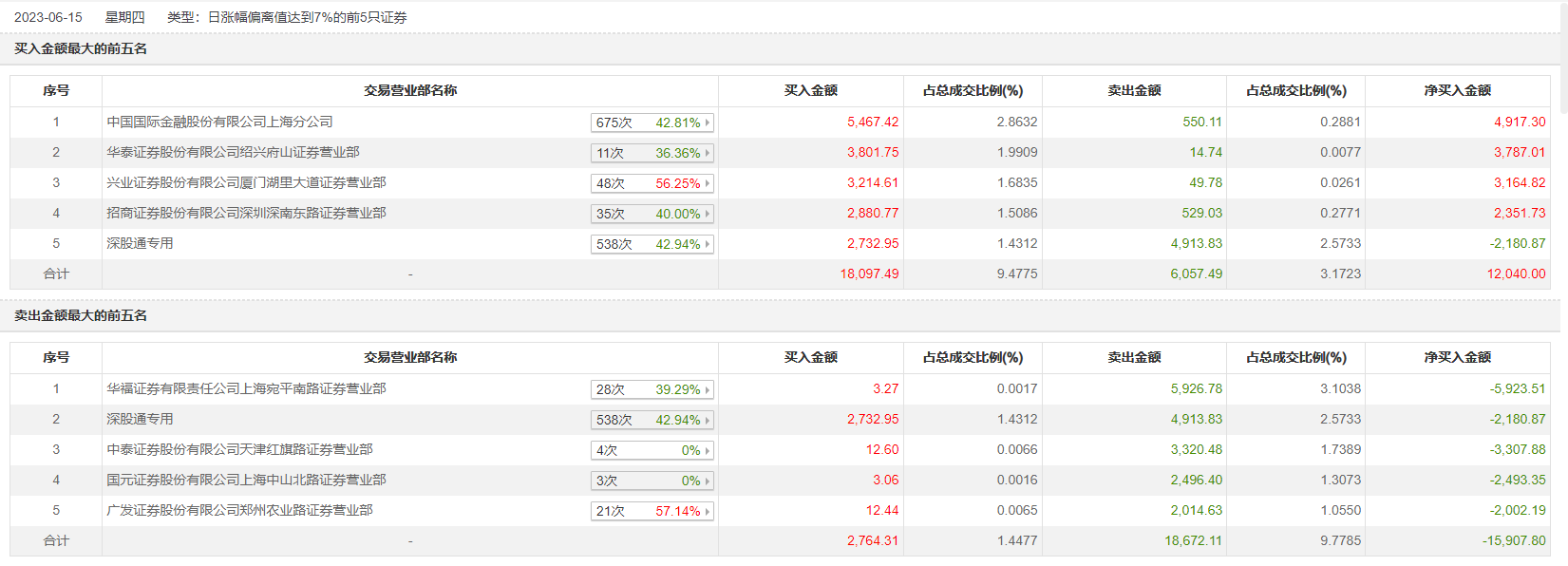具体来看,中国国际金融上海分公司、华泰证券绍兴府山证券营业部分别买入5467.42万元、3801.75万元;华福证券上海宛平南路证券营业部、深股通专用分别卖出5926.78万元、4913.83万元。
