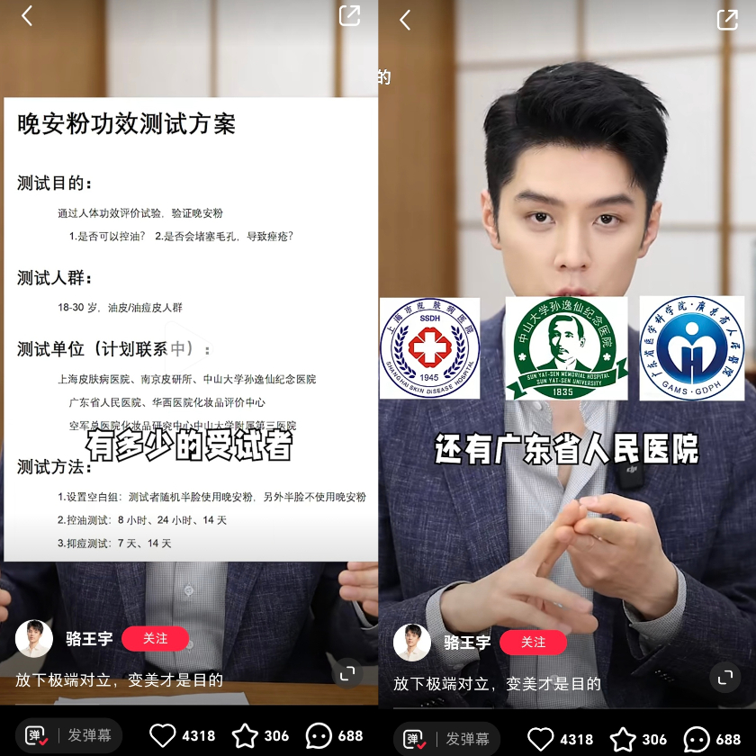 另外,骆王宇也强调了晚安粉不适用于所有人群。在视频中,他将产品定位于“专门设计给大油田的应急产品”,并表示,他从来不推荐给干皮、中性皮或者说正常出油的人群。如果局部出油特别多,也是建议局部去用。