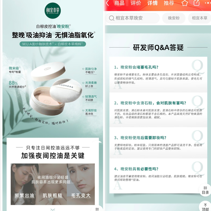 相宜本草也在前述文案中强调,“只专注日间控油远远不够,加强夜间控油是关键”“专为油皮而生,夜间定向吸油”,并在前述Q&A中表示,建议油皮尽量使用晚安粉。夜间油脂分泌旺盛,肌肤粗糙。晚安粉可在夜间帮助整晚控油。