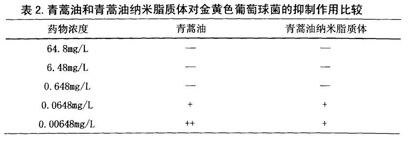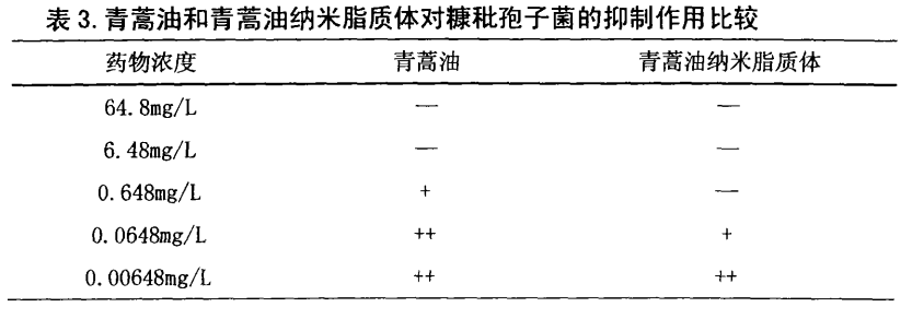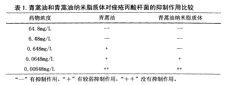 该实验证明了,青蒿油和青蒿油纳米脂质体对引起痊疮的三种致病菌:痊疮丙酸杆菌、金黄色葡萄球菌、糠批抱子菌均有不同程度的抑制作用,并确定了药物最低有效浓度。