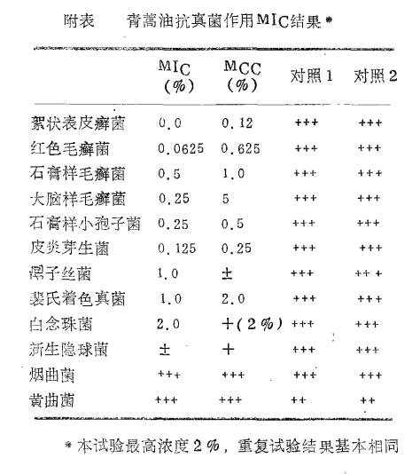 在《青蒿油抗致病性真菌作用实验报告》实验表明,青蒿油对皮肤癣菌、白念珠菌,抱子丝菌、裴氏着色真菌均具有明显的抑制作用,尤其对红色毛癣菌、石膏样毛癣菌和絮状表皮癣菌等我国常见的皮肤癣菌有显著的抑菌和杀菌作用。