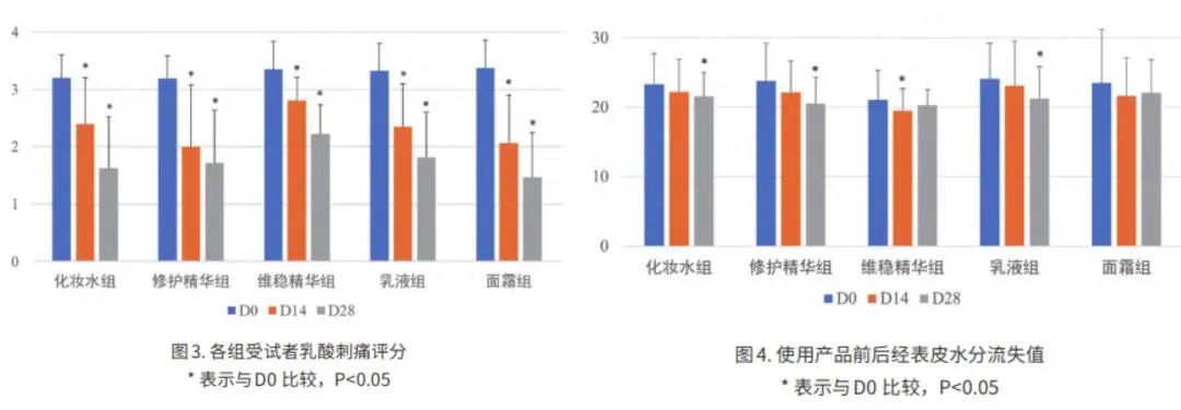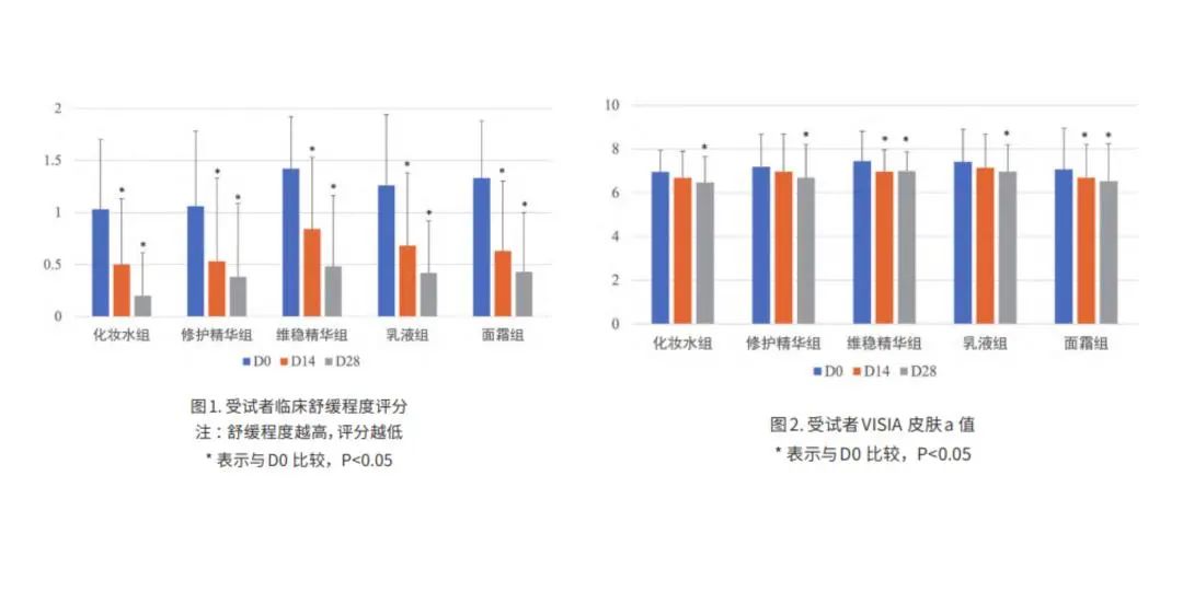 在《昆药青蒿原料的发展历程与敏感肌护肤的新应用》论文中,记录了青蒿油AN+产品的人体功效实测数据,选取选取5组 18~55岁敏感性皮肤的健康受试者,分别比较未使用前(D0),试用2周(D14),试用 4周(D24)含有青蒿油AN+的5种测试产品(青蒿舒缓维稳水、青蒿舒缓修护精华液、青蒿舒缓维稳精华液、青蒿舒缓维稳乳、青蒿舒缓维稳霜)