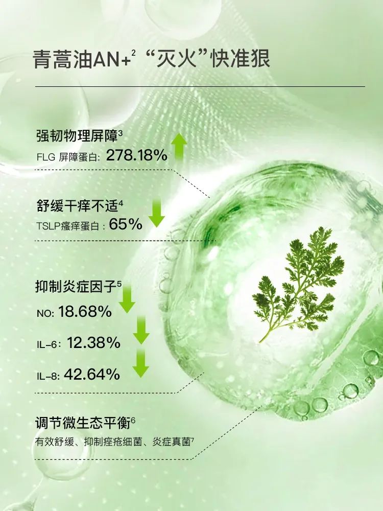 据了解,品牌核心成分青蒿油AN+主要通过提高皮肤微生物多样性,降低皮肤表面条件致病菌,来调节皮肤微生态。同时青蒿油AN+可以提高屏障蛋白FLG基因表达,起到皮肤屏障功能保护作用。另外,青蒿油AN+还可以抑制炎症因子,舒缓肌肤干痒不适,多通路改善敏感问题,强韧肌肤。