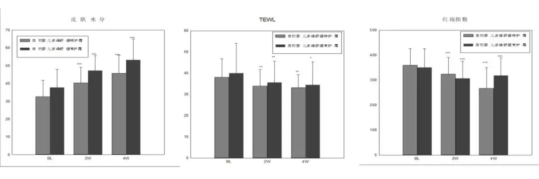 从实验数据不难看出,皮肤水分、透皮水分丢失(TEWL)、红斑指数(MI)在使用启初特护霜 / 常护霜2周,4周后均呈现显著性改善。