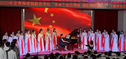 此次音乐会共分为上下两个篇章。音乐会在《盛世国乐》的鼓、筝齐奏声中拉开序幕,以西洋乐与民乐合奏、钢琴四手联弹、钢琴六手联弹、男女小合唱、混声大合唱、独唱、器乐独奏、服装秀等多种表演形式,为学校师生奉献了一场音乐视觉盛宴。节目《洪湖岸边是我家》《爱永在》《有我》穿越时空、跨越山河,饱含对祖国的热爱;《春花秋月何时了》《青玉案·元夕》传唱和诵读中华优秀传统文化的深厚文化内涵;《花儿为什么这样红》《哈尔的移动城堡》《玛依拉变奏曲》《爱的致意》《always smaller》悠扬婉转、清澈嘹亮,充满了世界情怀;《青春舞曲 库斯科邮车》《风·潮盛典》波澜壮阔、青春自信,引发了深切共鸣。在教师张艺林的指挥下,音乐教育专业全体学生共唱《在灿烂的阳光下》,以新时代青年的铮铮誓言,彰显赓续奋斗的青春力量。音乐会最后,一首男女生四重唱《再一次出发》在对祖国的赞美和新时代的讴歌中激发了师生们的凝聚力、向心力和奋斗力。整场音乐会气氛昂扬向上,现场高潮迭起掌声不断。