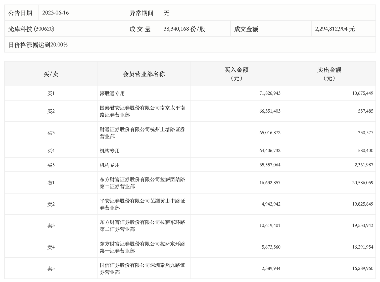 6月16日,光库科技今日涨停,龙虎榜数据显示,上榜营业部席位全天成交4.5亿元,占当日总成交金额比例为19.62%。其中,买入金额为3.43亿元,卖出金额为1.07亿元,合计净买入2.36亿元。