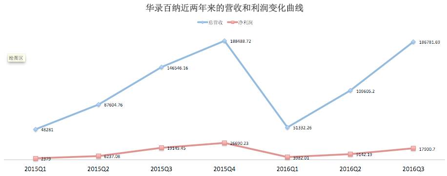 当然,账期放在Q4是很多行业的惯例,但作为行业的观察者,从这两个曲线可以看出华录百纳的总营收和纯利润在2015、2016两个财年里并没有特别的变化。
