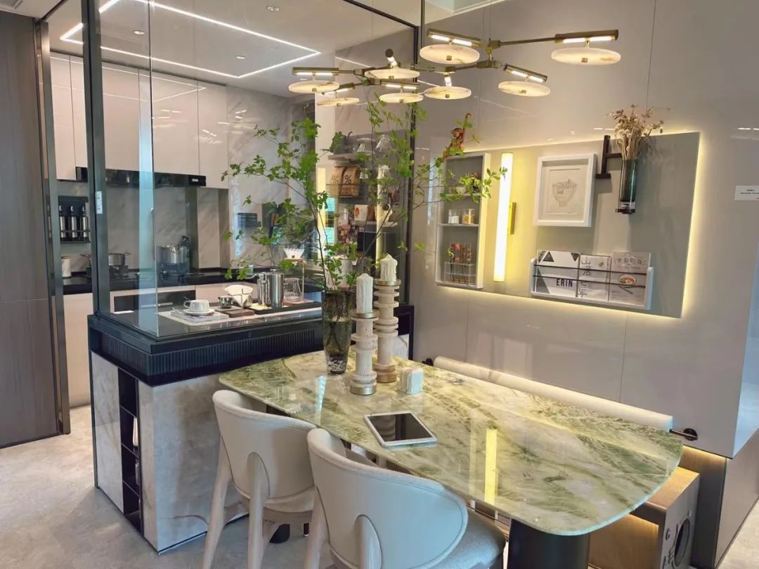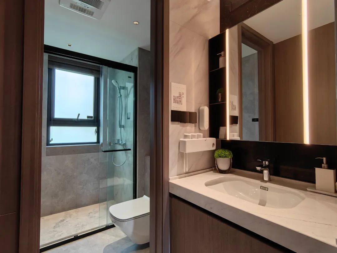 电视背景墙、卫生间背景墙整体岩板交付通过高颜值的岩板材质,打造空间一体化设计。