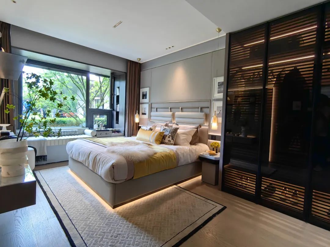主卧套房设计,动静分离,主卧开间约3.3米,进深约7.35米(含飘窗),同时交付主卧衣柜,在空间上实现了收纳功能最大化。