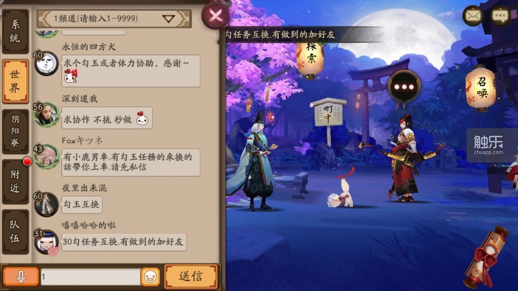 (《阴阳师》的世界频道采用了分频道设计来分流玩家,玩家可以随意发言,但有间隔)