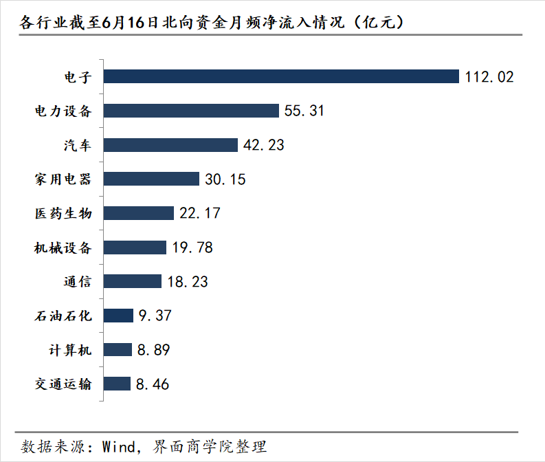 以申万31个一级行业为基准,Wind数据截至6月16日的月频申万一级行业数据显示,北向资金流入显著的前三板块分别为电子、电力设备以及汽车,月流入分别为112.02亿元、55.31亿元和42.23亿元。而北向资金撤出的前三板块分别为食品饮料、非银金融以及有色金属,月流出分别为83.98亿元、67.22亿元与39.31亿元。