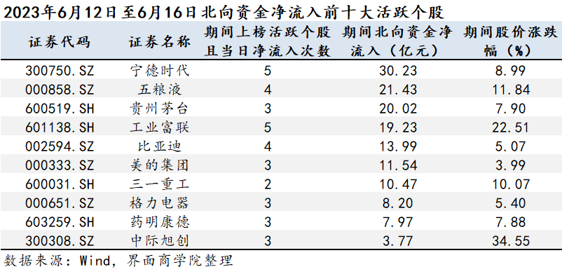 从北向资金个股的活跃程度看,宁德时代(300750.SZ)、五粮液(000858.SZ)、贵州茅台(600519.SH)、工业富联(601138.SH)、比亚迪(002594.SZ)、科大讯飞(002230.SZ)、中国中免(601888.SH)、隆基绿能(601012.SH)8只个股在北向资金6月12日至6月16日的5个交易日连续上榜活跃个股,其中宁德时代、五粮液、贵州茅台、工业富联、比亚迪以及科大讯飞呈资金净流入。