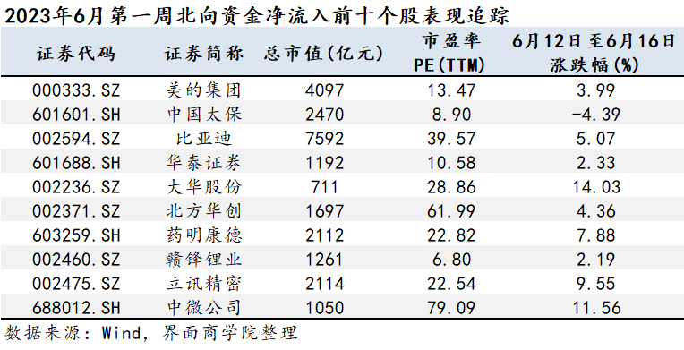 下图为上期2023年6月第一周北向资金净流入前十大个股的后续表现情况。数据截至2023年6月16日,追踪区间为2023年6月12日至6月16日。排序以上期资金净流入为基准。