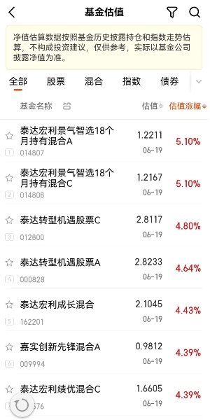 天天基金网提示,“净值估算数据按照基金历史披露持仓和指数走势估算,不构成投资建议,仅供参考,实际以基金公司披露净值为准。”