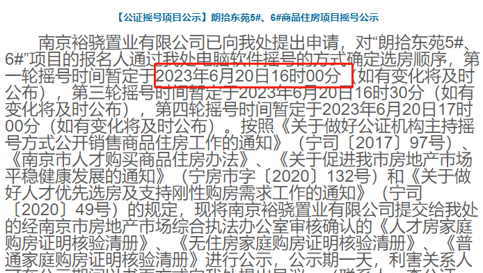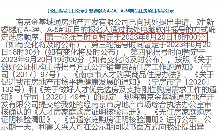 根据南京市公证处显示,项目第一轮摇号时间暂定于明天(2023年6月20日16:00)。