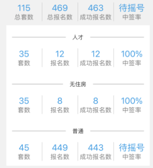 项目首开2、7号楼共100套房源(人才20套,无房30套),共吸引434组摇100套房源,中签率23%,平均5人抢1套房。
