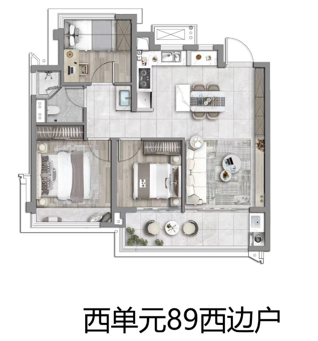 建面约89㎡西边户,三房两厅一卫设计,阳台和主卧飘窗带有转角,卫生间干湿三分离,南向双联阳台。