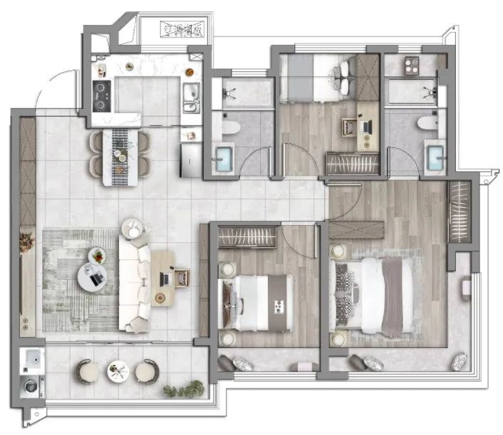 以143㎡玥尚来看,四房两厅户型设计方正,四室两厅两卫,南北通透,动静分离, LDKB一体化。主、次卧+客厅三开间南向,最大程度上保证日常居住的采光需求。贯穿次卧及客厅的超大阳台,给家庭生活空间保留更多的选择性。