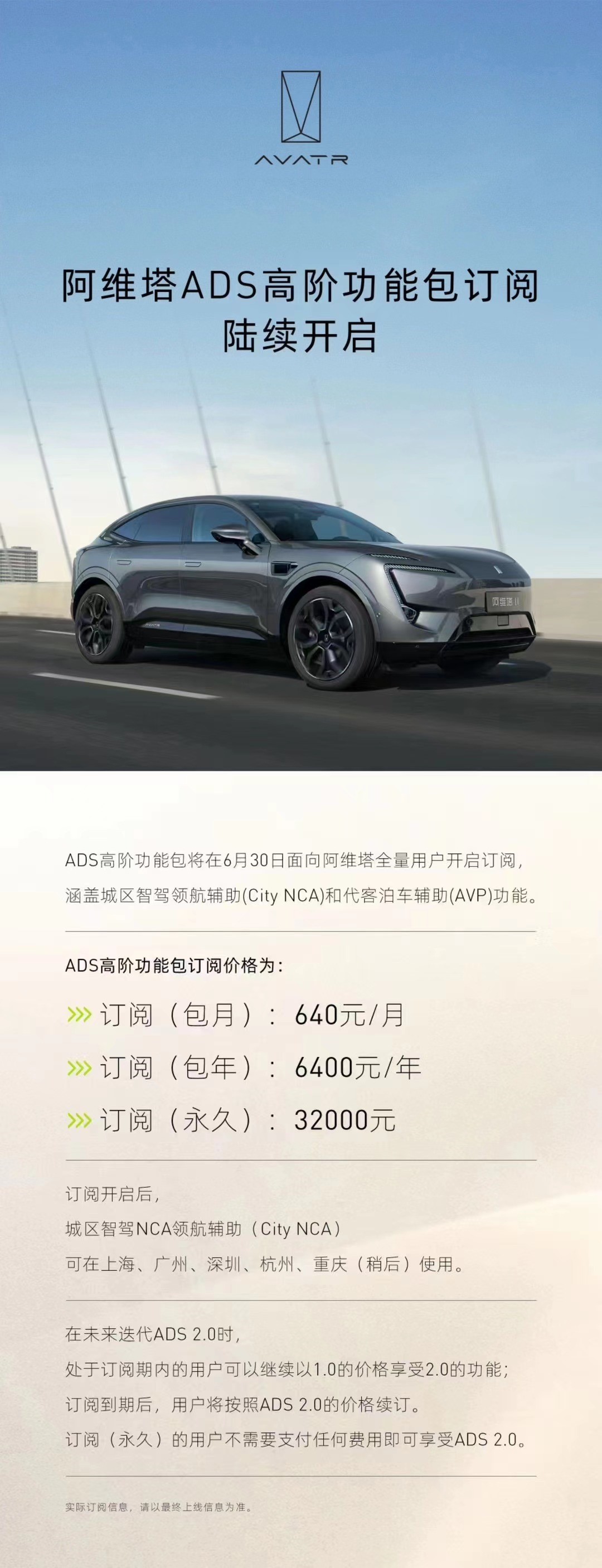 6月9日,阿维塔在2023重庆车展上宣布:ADS 高阶功能包将在 6 月 30 日前,面向全量用户开启订阅,涵盖城区智驾领航辅助( City NCA )和代客泊车辅助( AVP )功能。订阅开启后,城区智驾领航辅助(City NCA)可在上海、广州、深圳、杭州使用,稍后将覆盖重庆。