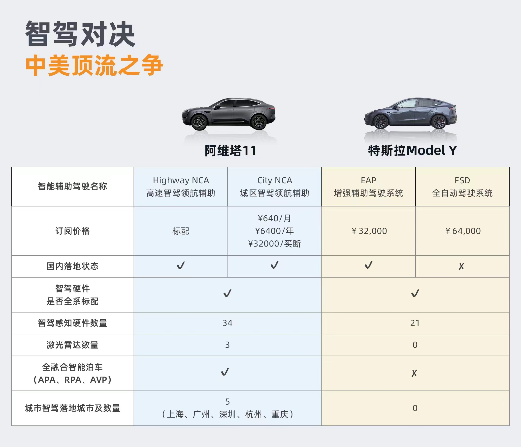 和特斯拉Model Y相比,阿维塔11同样是32000元的价格,但是可以实现City NCA功能的永久使用。用户可以享受到高速智驾、城区智驾以及全融合智能泊车等功能。显而易见,相比特斯拉Model Y,阿维塔11展示了「智驾平权推进者」的市场诚意。
