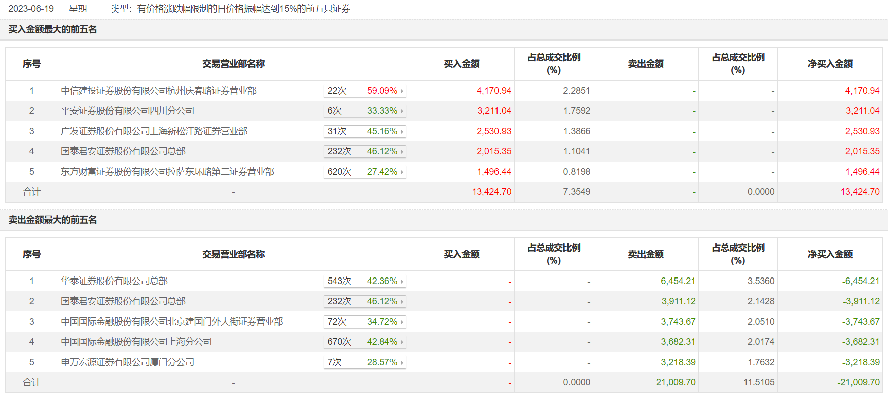 具体来看,华泰证券总部、国泰君安证券总部分别卖出6454.21万元、3911.12万元;中信建投证券杭州庆春路证券营业部、平安证券四川分公司分别买入4170.94万元、3211.04万元。