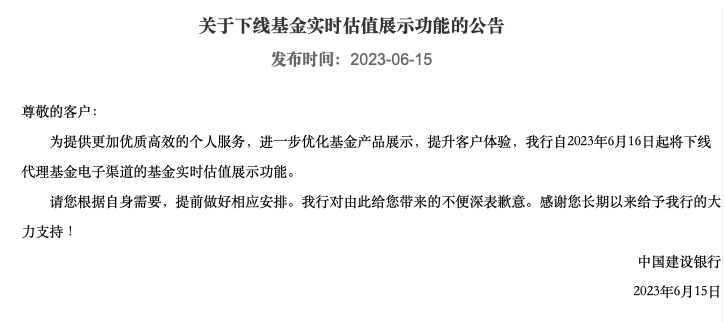 建设银行公告称,2023年6月16日起,下线代理基金电子渠道的基金实时估值展示功能,“为提供更加优质高效的个人服务,进一步优化基金产品展示,提升客户体验。”