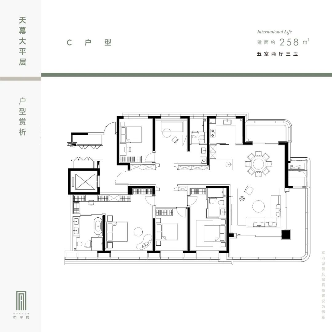 户型特点:建面约258㎡5室2厅3卫户型,相较于建面约248㎡来说,总体上是四房和五房的区别,仅10㎡的面积差,就多了一个房间功能。