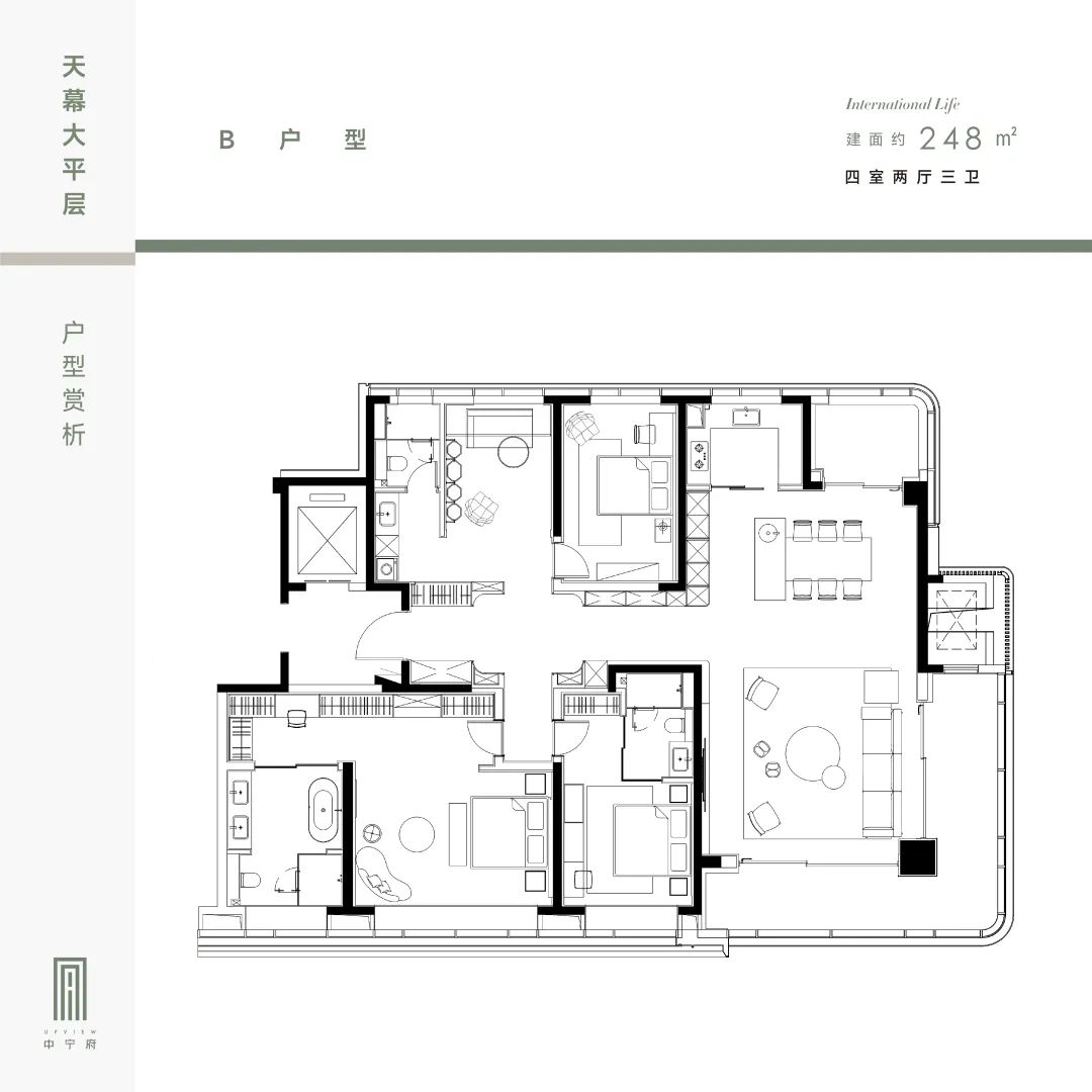 建面约300㎡四房三厅四卫:四开间朝南,大横厅开间约9米,南向双阳台约12米,视野开阔,采光和通风效果佳,主卧为套房设计,带衣帽间和独立卫浴。