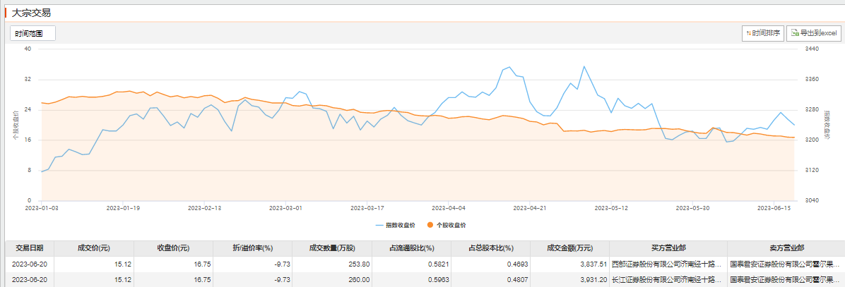 索通发展6月20日大宗交易成交513.8万股,成交额7768.71万元,占当日总成交额的47.43%,成交价15.12元,较市场收盘价16.75元折价9.73%。