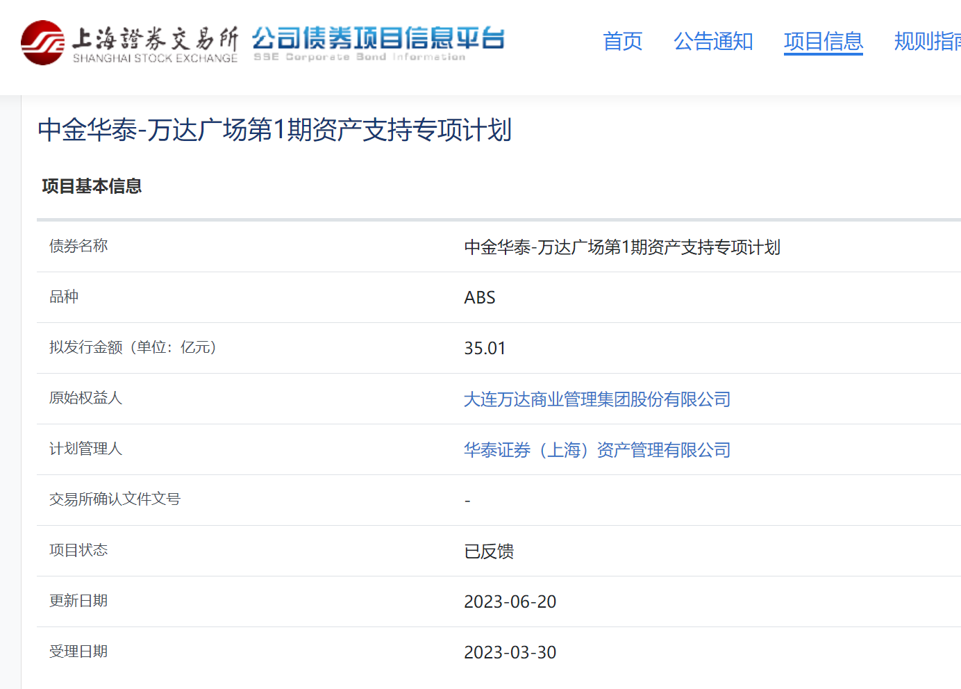 6月21日,据上交所公司债券项目信息平台显示,中金华泰-万达广场第1期资产支持专项计划项目状态更新为“已反馈”。该债券品种为ABS,拟发行金额35.01亿元,原始权益人为大连万达商业管理集团股份有限公司,计划管理人为华泰证券上海资产管理有限公司。