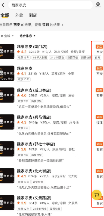 除了西安以外,侃见财经尝试搜索了其他城市,魏家凉皮的门店同样显示仅支持“到店”,外卖暂停。