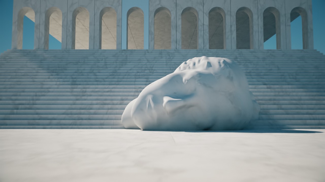 空无一人的意大利文化宫,白色大理石的建筑,你在其中漂浮、旋转,身边掠过古罗马石柱与雕塑。白色头颅雕塑悬在半空中,庞大得令人恐惧。巨大的彩色Policromia腕表在纯白的雕塑、石柱间里缓缓裂开,钻、石雕、机械,一点一点分散,与建筑融为一体。