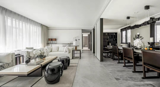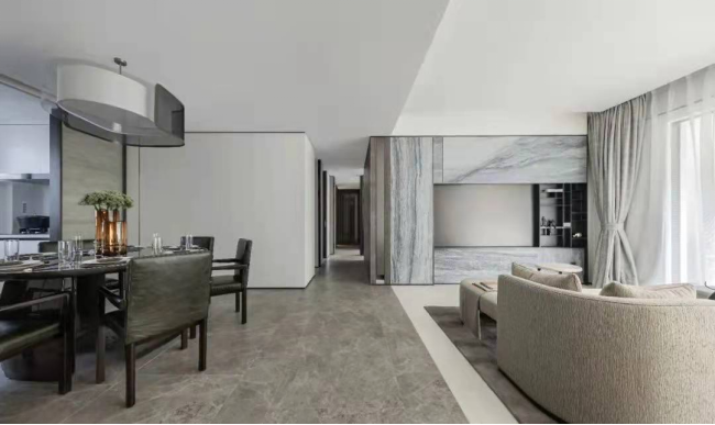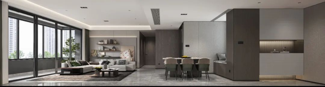 LDK一体化超大客餐厅,功能可随需求灵活变动,形成家庭社交场域;客厅+次卧连通约9米跑道级瞰景阳台,引阳光与美景入室。