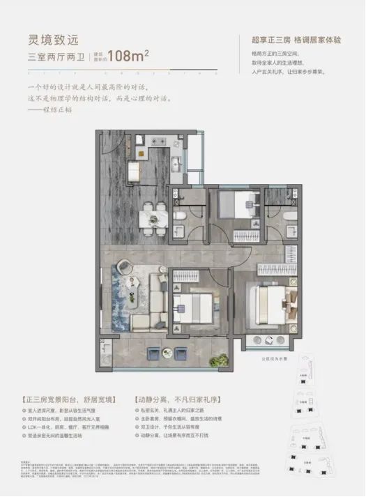 建面108㎡户型也为三房两厅两卫布局,三开间朝南,格局方正;LDK一体化,厨房、餐厅、客厅无界相融;双开间阳台,揽尽自然风光;主卧套房,预留衣帽间。