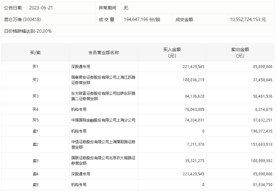 6月21日,昆仑万维今日跌停,龙虎榜数据显示,上榜营业部席位全天成交13.61亿元,占当日总成交金额比例为12.9%。其中,买入金额为5.99亿元,卖出金额为7.63亿元,合计净卖出1.64亿元。