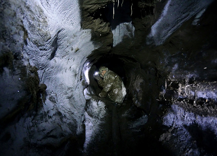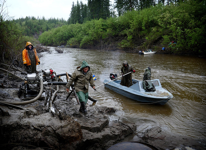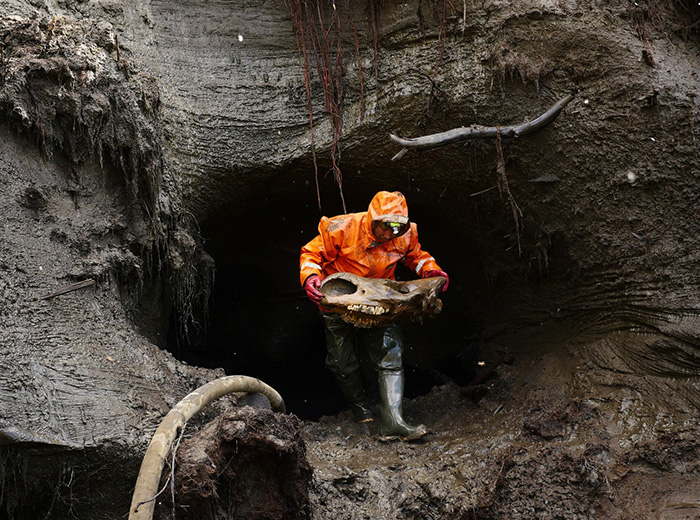 这里一共有60人,他们中大多数人是卡车司机或工厂工人,这个夏天一直在这里用改装自消防设备或雪橇引擎的水泵在200英里深的地下打隧道。目的在于移除表层的冻土,挖掘出埋藏了数千年的动物残骸。几乎不间断的白天让他们得以每天工作到深夜,每隔两周,有些人会回到城市采购物资,像是汽油、通心粉、牛肉罐头、驯鹿肉以及大量的烈酒。“大部分人都会醉上个两天,再用一天时间恢复过来,” Chapple说。