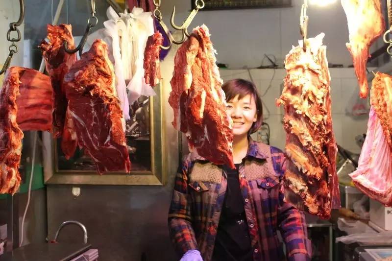 瞄见来了客人,Ayisha站在厚厚的肉帘背后大声招呼,老外闻声弯下腰、侧着头,才能从几条倒挂的牛肉大腿中追踪到她的视线。