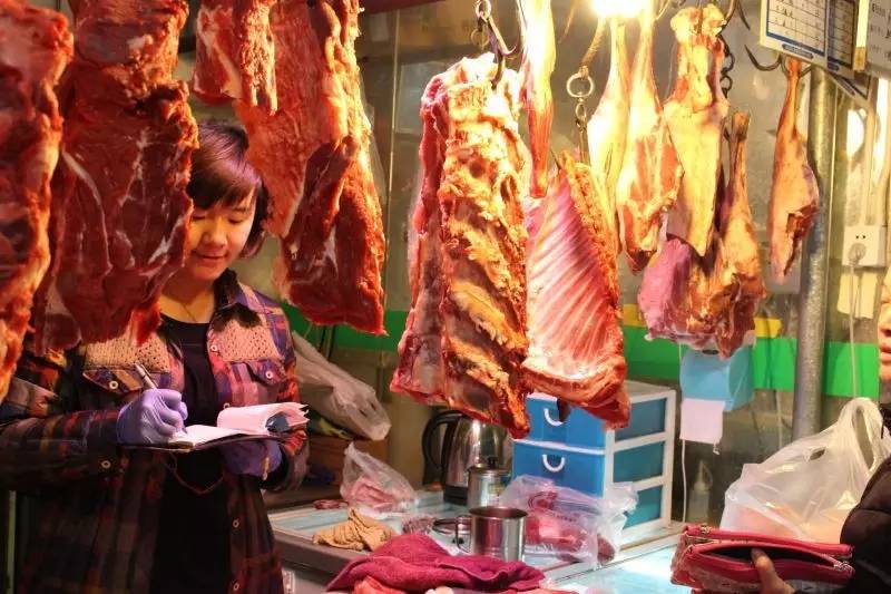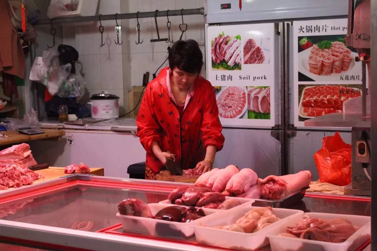白天大部分时间,猪肉铺里只能看到着鲜艳红衣的老板娘,她笑脸迎客,挥刀剁肉。