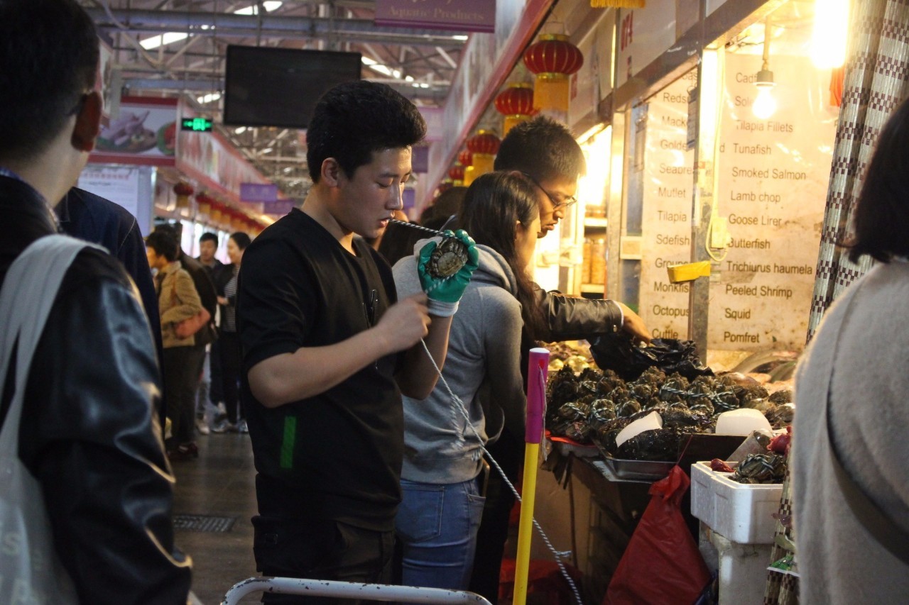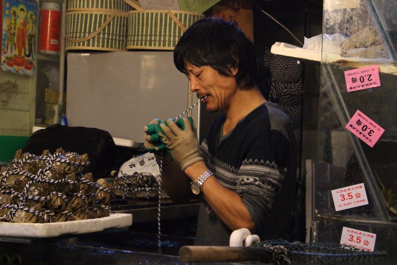 海鲜店的老板们都有一手绑螃蟹的绝活,左手大拇指按住螃蟹两个大钳子,其他脚顺势被蜷起来,牙齿绷住绳子一端,左绕两圈右绕两圈,再打个结、剪一刀,五花大绑完成。