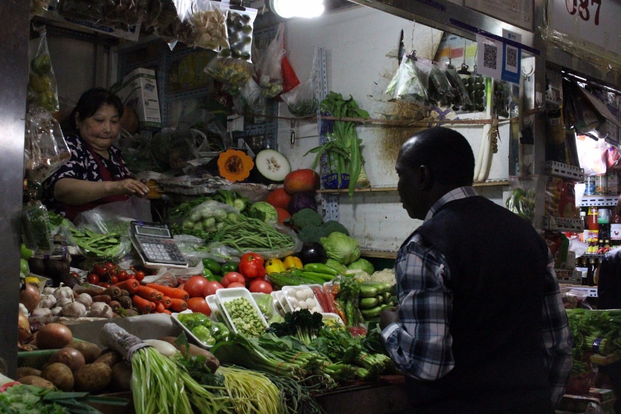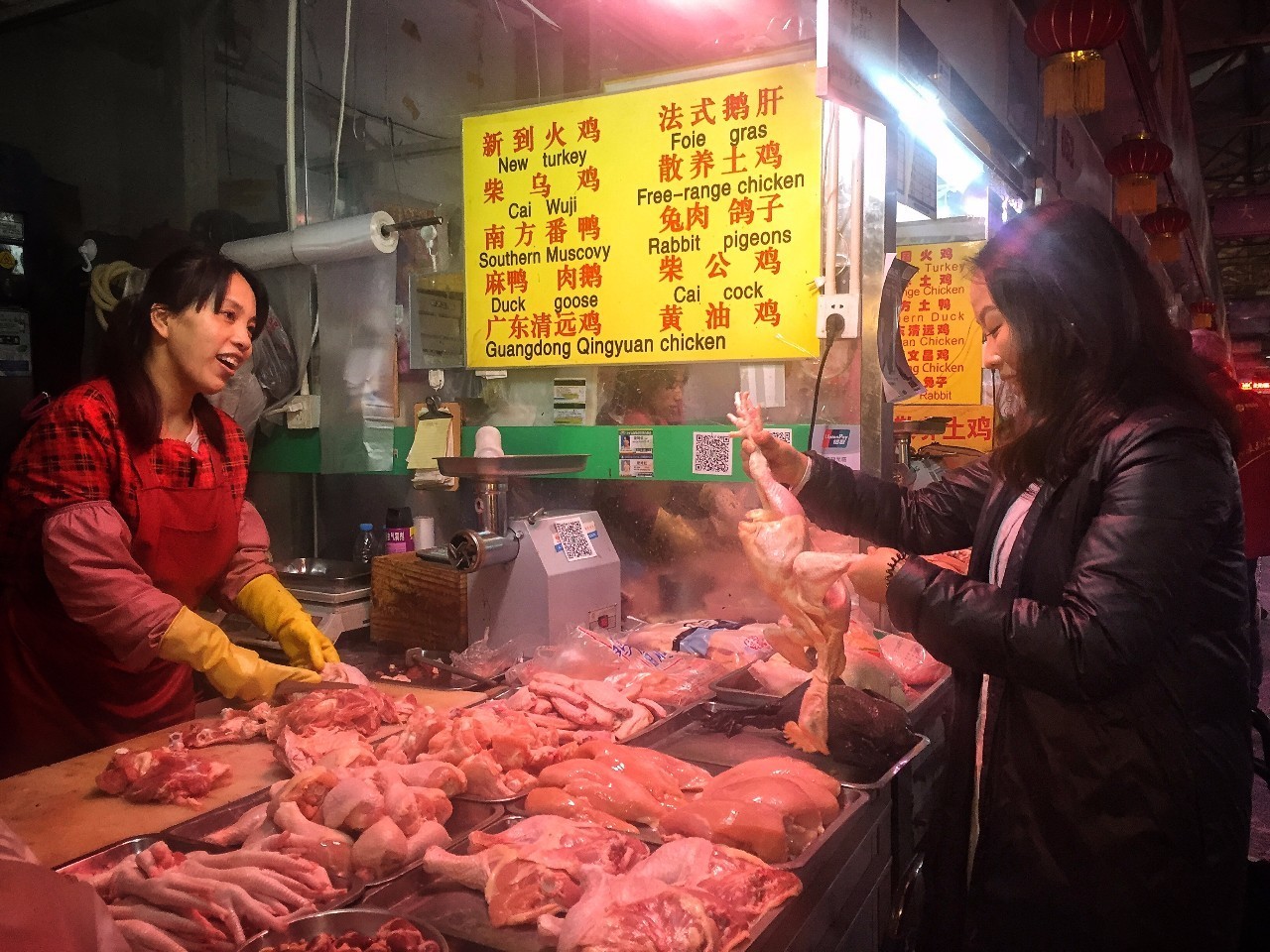 没有客人的时候,Ayisha会掏出手机学学阿拉伯语,手机上装了六个教初级阿语的APP,她用戴着塑料手套的手指点开一课便跟着念。大学时选错专业读了会计,在菜市场,她才后知后觉地发现自己的语言天赋,把买肉的外国客人都当成口语老师。「在这儿,不会外语根本混不下去。」