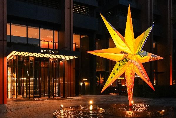 酒店入口处摆放由丽安文化呈现艺术家陈亮为上海宝格丽酒店五周年设计的八芒星艺术装置,其创作灵感来源于每个星空闪烁的夜晚,象征着希望;绘于星星上的图案,象征着银河;金属材质镜面的八芒星随日夜变换光束,与周围环境融为一体,白天映照阳光,日落时变成美丽的金色,入夜后反射星光愈加明亮。八芒星跟随光线变幻散发多彩光芒,映照多姿多彩的欢愉生活。