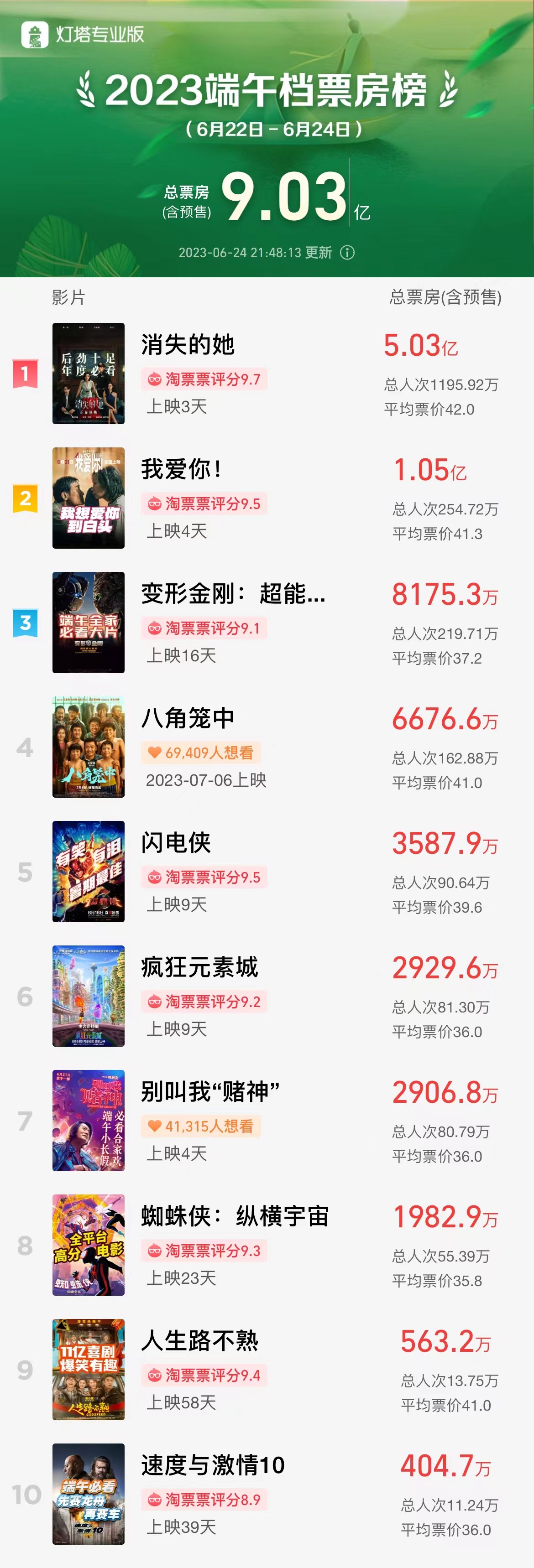 据灯塔专业版实时数据,截至6月24日21:26分,2023年端午档(6月22日至6月24日)总票房破9亿,超过2016年端午档,成为中国影史端午档总票房第二,观影总人次2224万人,总场次128.2万场。