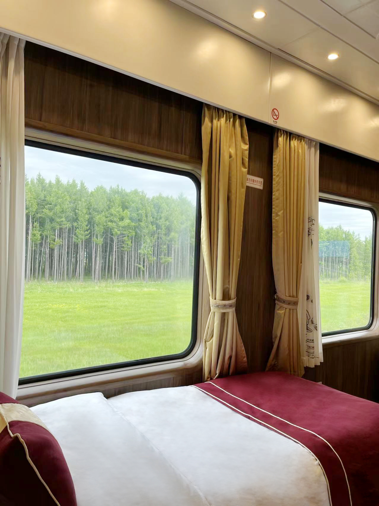 与一天掰成48小时用、堪比军训拉练的“特种兵式旅游”相比,5天4晚的火车旅行同样拉满了周密的“行程表”,但却是截然两样的途中光景:180度躺平观赏窗外成片流动的白桦林、蜿蜒的湿地和自由的飞鸟,在喂饱眼睛的同时与家人好友共享中蒙西式Set Menu,在咖啡香气中与陌生的同路人从诗词歌赋聊到人生哲学…既有“日行三万步”的豪情,也是闲庭信步式的探寻。
